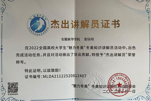 2022年2月将在中国北京举办冬季奥林匹克运动会,筹办北京冬奥会是我国重要历史节点的重大标志性活动,是展现国家形象、促进国家发展、振奋民族精神的重要契机,而2022全国高校大学生“魅力冬奥〞冬奥知识讲解员活动秉着弘扬冬奥精神,传播冬奥知识的目的举办,bat365在线中国官网登录入口药学院21级药学一班张钰培同学通过互联网参加了全国高校大学生“魅力冬奥”冬奥知识讲解员活动,她通过互联网方式进行冬奥会知识讲解传播,并积极弘扬冬奥精神,传播冬奥知识,为冬奥会助力,由此获得了活动组委会颁发的“杰出讲解员”荣誉证书。