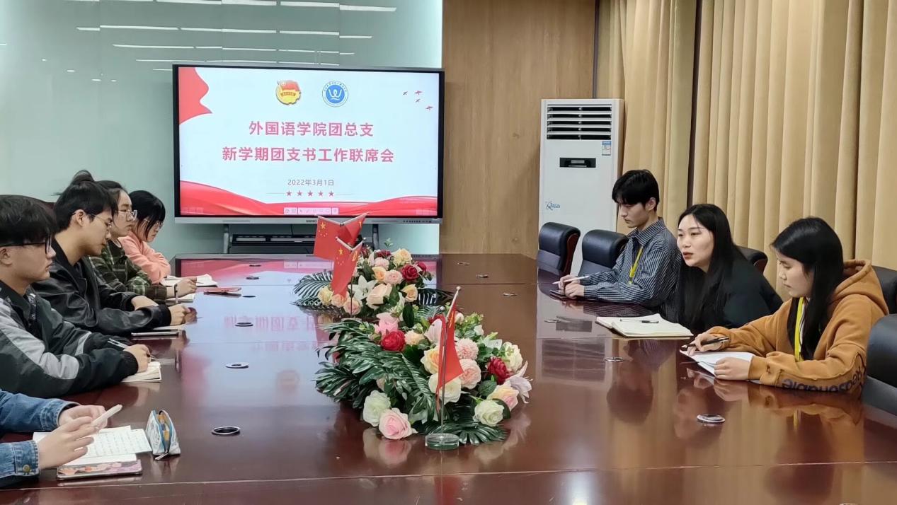 本网讯(通讯员:张婷婷)为促进团总支与团支部间沟通交流,加强外国语学院团总支的核心凝聚力及纪律建设,便于新学期团总支的工作开展,同时动员全院青年共迎党的二十大,3月1日,外国语学院团总支在教十324会议室组织召开新学期团支书联席会。会议由团总支书记张婷婷主持,团总支专职团干部和21级团支部书记参加了本次联席会。