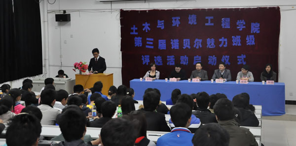 4月8日,土木与环境工程学院举行了 “迎评促建、树优良学风,营造良好育人环境”为主题的“诺贝尔魅力班级”评比启动仪式。该院团总支书记介绍了开展“诺贝尔魅力班级”评比活动的背景及预期目标,并就具体的评选方案和指标做了详细解读。随后,该院副院长计勇作了动员讲话,他说,今年的评选活动要把班级建设从注重结果转变到注重过程建设上来,紧紧围绕学风建设、育人环境建设和活动开展这三项重点,形成班集体的自觉建设与学生管理的过程督导、建设指导、验收评价、表彰宣传相结合的有机整体,以“诺贝尔魅力班级”评比活动为契机,在原有基础上,将全院各项学生工作推上一个新高度,提高学风建设水平,营造良好的育人环境,为本科评估奠定基础。