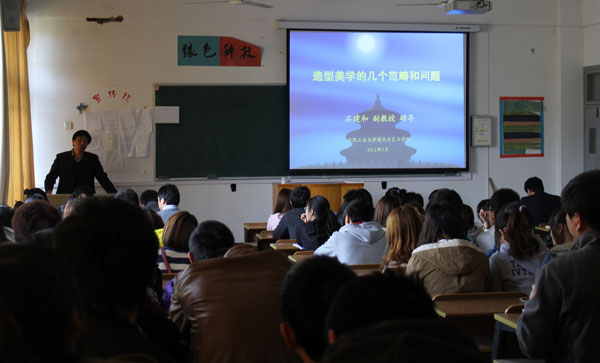 在讲座中,石建和以其丰厚的专业知识向同学们阐述了美的定义,他指出美是物体的形式,美是理性的内容表现于感性的形式,美是内涵与外在形式的统一。他用一些实际例子向同学们解释了艺术系的学生在美学方面该达到一个怎样的程度。同时,他还介绍了美学的类别、特点以及美学发展史,并和师生们分享了审美的四个层次,即材料元素层、意义美、形式化与技法、哲学层面的解读。在整场讲座中,石建和始终紧紧围绕造型美学展开,还为同学们分析了艺术与技术的涵义以及其相互依存的重要关系,他鼓励同学们能大胆创作,抓好艺术的技能和修养。