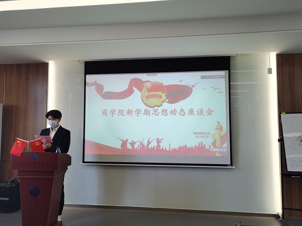 本网讯(通讯员:刘昌艳)新学期伊始,商学院团总支为及时掌握新学期学生的思想动态,使本学期学生教育管理工作,疫情管控工作更具针对性与实效性,了解大家封校情况下的日常生活,同时做好疫情防控下的各种准备工作,为本学期工作的开展提供了指向性信息,商学院团总支于4月10日14:30,召开春季思想动态座谈会。 参加此次会议有商学院执行院长翟荣兵、商学院院长陆克斌、商学院教学院长刘冬艳、商学院团总支书记刘晓蓉,以及商学院各个班级的学生代表。