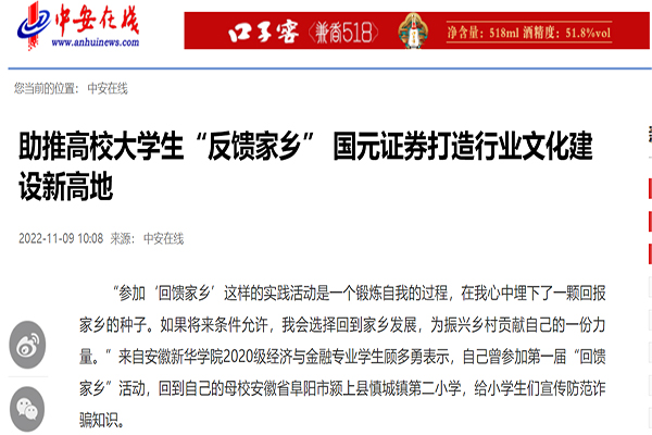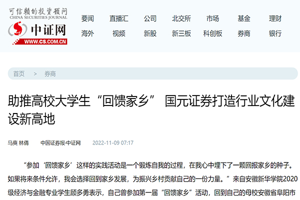 本网讯(通讯员:夏阳)近日,bat365在线中国官网登录入口联合国元证券开展的“回馈家乡”活动引起国内多家主流媒体广泛关注。中国教育新闻网、腾讯网、凤凰网、中证网、中安在线等分别对这一事件进行报道、转载和跟踪访问。
