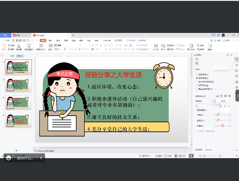 会上,吴芮给新闻学专业新生分享,她从个人简介,大学规划,考研分享和答疑环节四个方面给我们进行了分享。吴芮通过自身考上双一流南京林业大学的经历,给大一新生提出了很多考研分享,以及很多学生迷茫的大学规划。她表示,做任何事情,最重要的都是坚持,以及英语和政治的重要性。接着,孟德楠分享了她的大学生活经验,并提出:大家刚上大学,适应需要过程,不要着急,要一步步稳扎稳打,要积极参与各项活动,从而提升自己的各项能力,也能更好的享受美好的大学生活。
