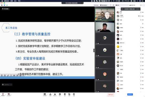 会上,各系教师先后运用PPT结合详细的汇报,阐述了本学期的工作情况及下学期工作计划,其中各系教师就师德师风、教学工作量、教学效果、教学能力、教学改革、科研创新与社会服务、特色工作等内容进行了详细的汇报。各系主任分别就本年度工作成果、待改进问题以及2023年工作展望进行了汇报,系统地总结了本年度工作的成绩和经验,为未来系部与专业发展提供了新思路。