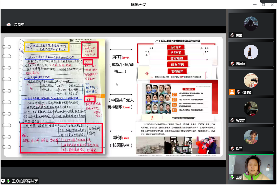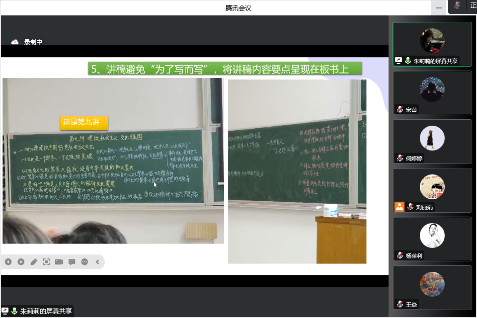 本网讯(通讯员:宋苗)教案和讲稿是教师组织教学的必备文件,是保证课堂教学质量的前提。为进一步规范教师备课及教案讲稿编写工作,促进教师不断改进教学模式、创新教学方法、提升教学水平和质量,12月30日下午,马克思主义学院组织开展教案讲稿比赛。此次比赛以线上形式开展,由教研室主任刘丽娟主持,副院长董丽娟、教研室主任王静、教研室主任李红霞、教学秘书章凤萍、各课程组负责人及部分教师代表出席并参与评审。