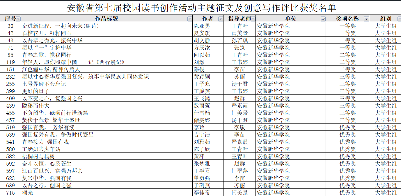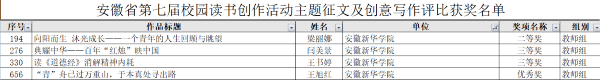 本网讯(通讯员:严素霞)近日,由省委教育工委、省教育厅、省人力资源和社会保障厅、省文化和旅游厅、省新闻出版局、团省委共同主办的安徽省第七届校园读书创作活动落下帷幕,bat365师生在本次活动中喜获佳绩,获得各类奖项共32项,其中一等奖4项、二等奖5项,三等奖10项,优秀奖13项。获奖名单如下: