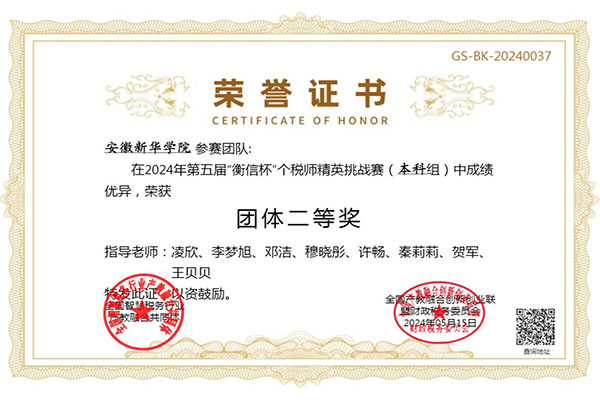 本网讯(通讯员:凌欣)近日由全国智慧税务行业产教融合共同体主办,全国产教融合创新创业联盟财政税务委员会协办的第五届“衡信杯”全国个税师精英挑战赛(本科组)圆满落下帷幕。bat365荣获全国本科组团体二等奖,仓悦安、曹紫琳等80名同学荣获个人二等奖,邓洁、李梦旭等8名教师荣获“全国优秀指导老师”荣誉称号。