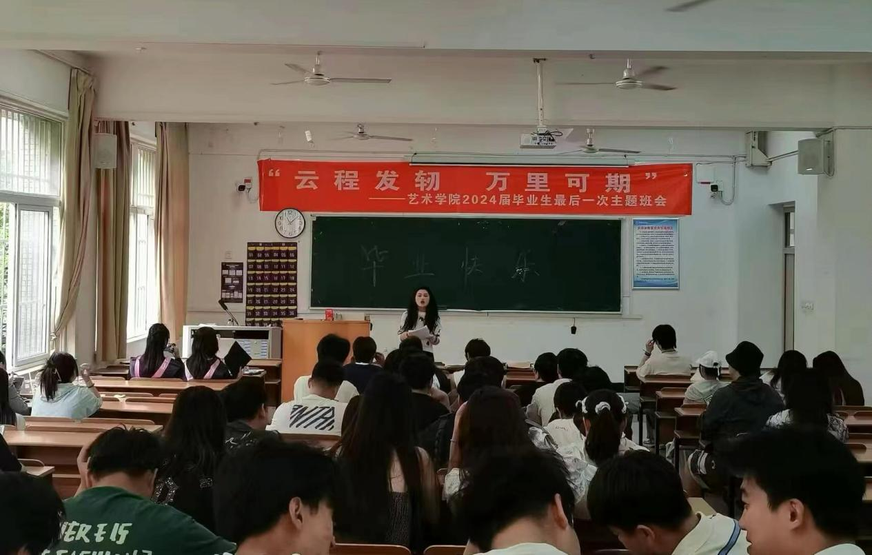艺术学院在教学11号楼104教室召开2024届毕业生文明离校主题班会。班会上,毕业班辅导员深情回顾了学生们成长的点点滴滴,共叙同学情谊、师生情谊、母校情谊;同时对毕业派遣、学籍档案、党员档案、党团员关系转接、助学贷款确认、医保报销、毕业证学位证领取等离校工作事宜进行布置与安排,要求同学们文明离校、安全离校、有序离校。