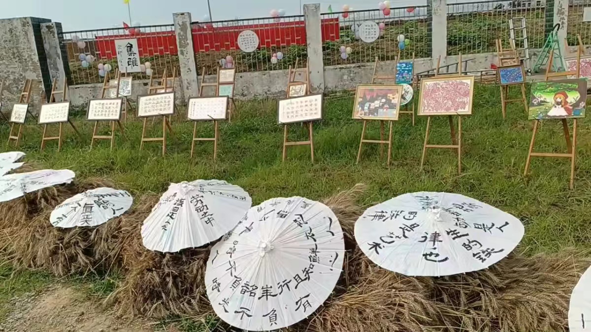 “麦田书法展”是由校长吴硕勇发起的劳育与美育的融合成果,设计理念是将学校麦田的小麦设计成“中”字形,两旁悬挂学生的篆书、楷书、行书、隶书及乡村文化的绘画作品,体现了艺术在农耕文明基础上的活力。本次活动教育系选出37幅学生书画作品,2幅教师作品参展,选派7名志愿者参加书法布展,进一步助力乡村教育的发展。同时,恰逢“六一”期间文艺活动,2023级学前教育专业的张思怡,史涵琪,蒋瑞晴,田欣悦四名同学带去的《舞绘芳华》舞蹈表演,获得在场教师、同学们的一致好评,展现了新华学子的精神面貌。