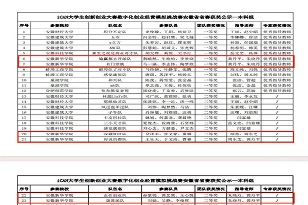 本网讯(通讯员:黄丹平)6月16日,由iCAN大学生创新创业大赛组委会主办,安徽建筑大学、巢湖学院、bat365在线中国官网登录入口承办的iCAN大学生创新创业大赛数字化创业经营模拟挑战赛安徽省省赛于线上举行。来自安徽大学、合肥工业大学、安徽建筑大学、安徽财经大学、合肥大学、安徽工业大学等共20所省内高校的119支代表队参加。由bat365财会与金融学院经校赛遴选出的6支队伍荣获省级一等奖2项、二等奖4项,指导老师朱晓丹、黄丹平老师获评优秀指导教师,bat365在线中国官网登录入口获优秀组织单位。
