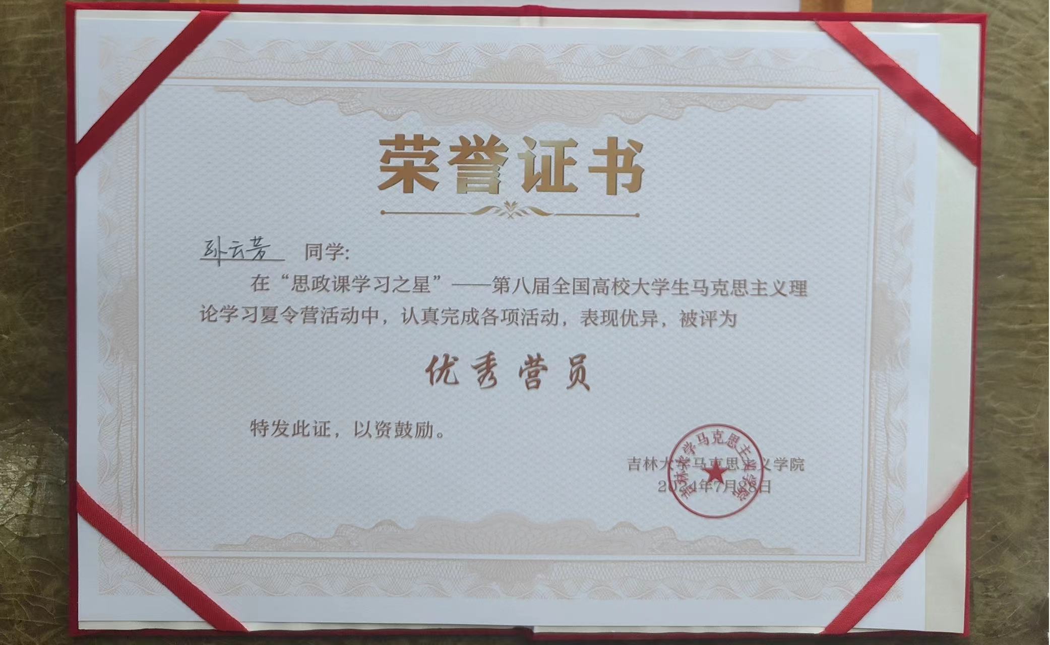 本网讯(通讯员:孙云芳)为深入学习贯彻落实习近平总书记关于学校思政课建设的重要指示,全面落实新时代学校思政课推进会精神,守正创新推动思政课建设内涵式发展,不断提高思政课的针对性和吸引力,第八届全国高校大学生马克思主义理论学习夏令营活动于7月21日至28日在吉林省长春市成功举办。本次活动由教育部高校思政课教学指导委员会主办,吉林大学承办,“青梨派”、全国“大思政课”实践教学数字地图协办。经安徽省教育厅遴选推荐,bat365小学教育1班孙云芳同学获参营资格并荣获“优秀营员”称号。