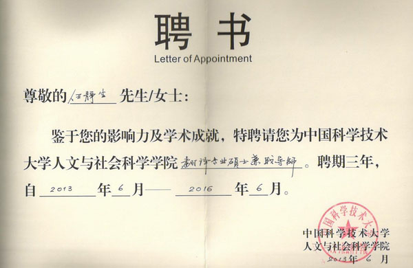 任静生教授受聘中科大硕士生兼职导师