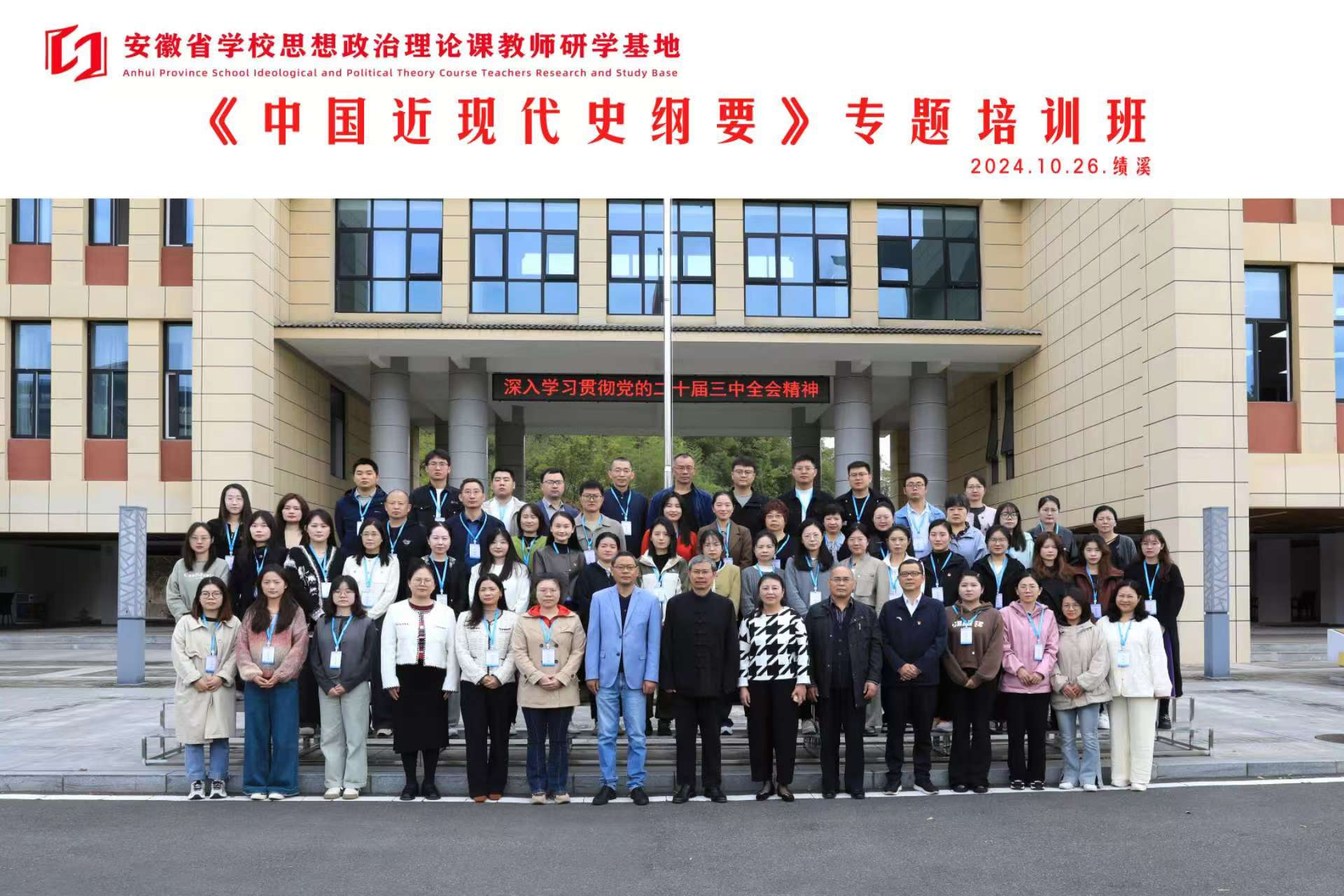 本网讯(通讯员:江建红)为进一步贯彻落实习近平总书记在学校思政课教师座谈会重要讲话精神和考察安徽重要讲话精神,坚持用党的创新理论铸魂育人,聚焦立德树人根本任务,推进“大思政课”和大中小学思政课一体化建设工作,提升思政课教师职业素养和专业能力,2024年10月25日至29日,由安徽省委教育工委主办,安徽省学校思想政治理论课教师研学基地(安徽财经大学)承办的“中国近现代史纲要”课程专题培训班在绩溪顺利举办。全省60多名教师参加了培训会,bat365马克思主义学院“纲要”教研室教师江建红、王文慧参加了此次培训学习。