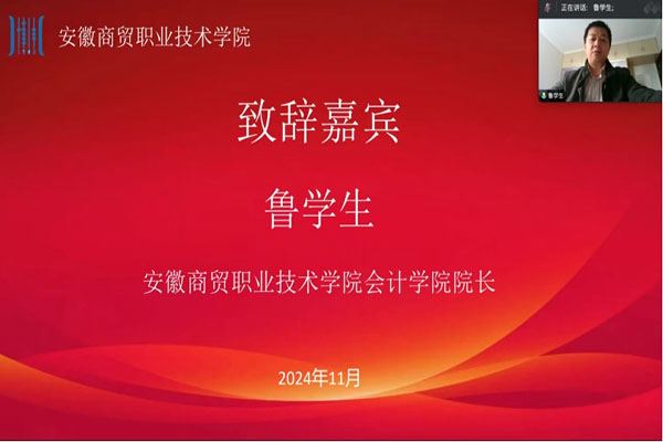 安徽商贸职业技术学院会计学院院长鲁学生代表大赛承办校致辞,他表示希望通过此次竞赛进一步提升参赛选手财务数智化素养及运用新技术解决财务问题的能力。同时够借助此次竞赛,学习新技术、解决新问题、磨炼新技能,成为新时代背景下所需要的数智化人才。