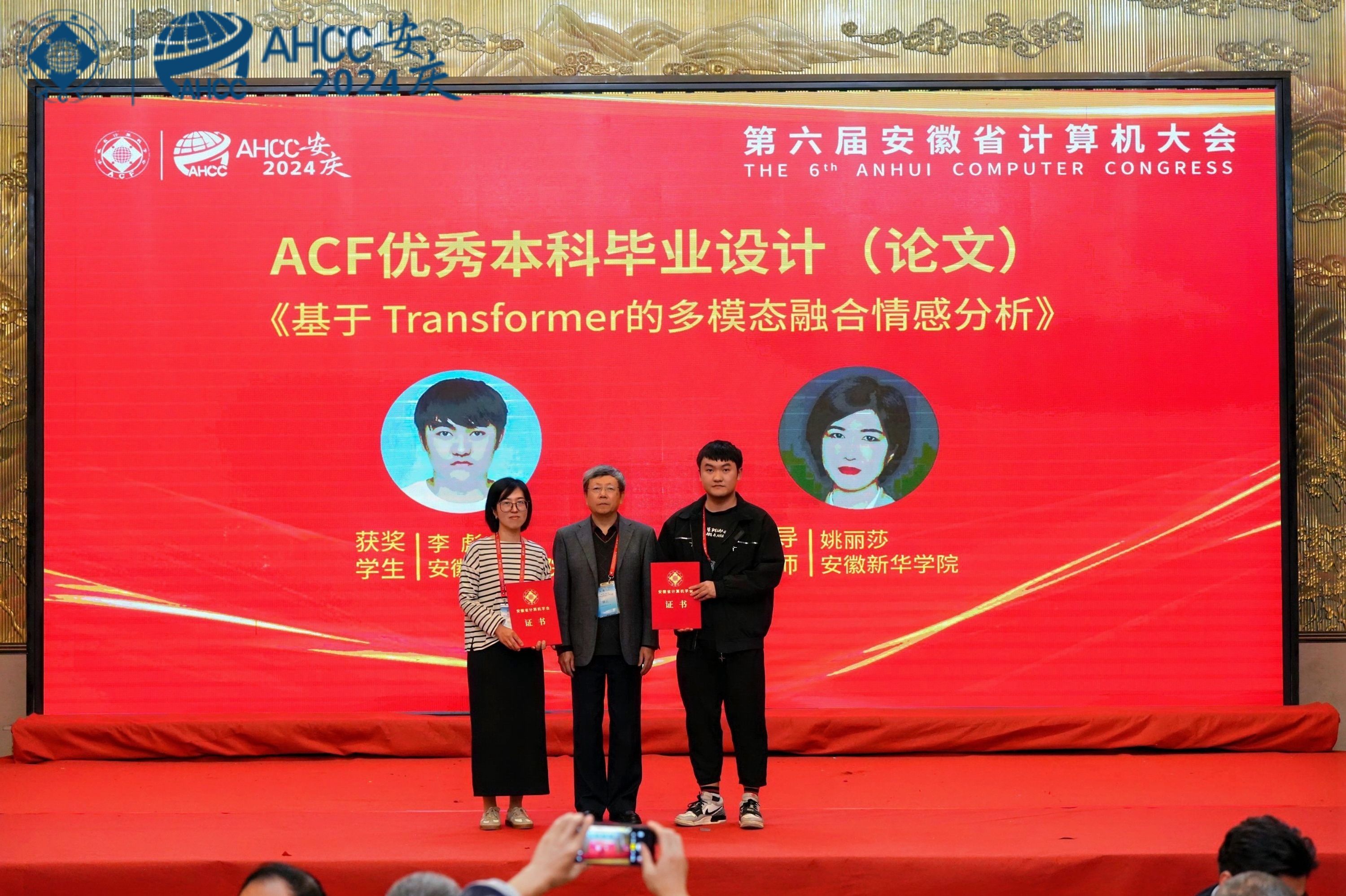 此外,大会还颁发了2024年度“安徽省计算机学会优秀青年科学家”、“安徽省计算机学会优秀博士学位论文”、“安徽省计算机学会优秀硕士学位论文”、“安徽省计算机学会优秀本科毕业设计(论文)”等奖项,以表彰在计算机科学领域做出杰出贡献的个人和团队。其中,我院姚丽莎老师指导的李彪同学的《基于Transform的多模态融合情感分析》荣获“安徽省计算机学会优秀本科毕业设计(论文)”,展现了新一代青年学者的科研实力和创新精神。