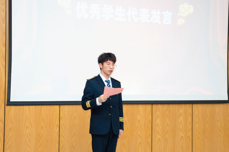 优秀学员代表,表达了对航空服务专业的热爱,向学校领导、老师辛勤付出和培养表达感谢,并表示将不负韶华,珍惜青春时光,勇敢追逐梦想,为早日实现“蓝天梦”不懈奋斗。