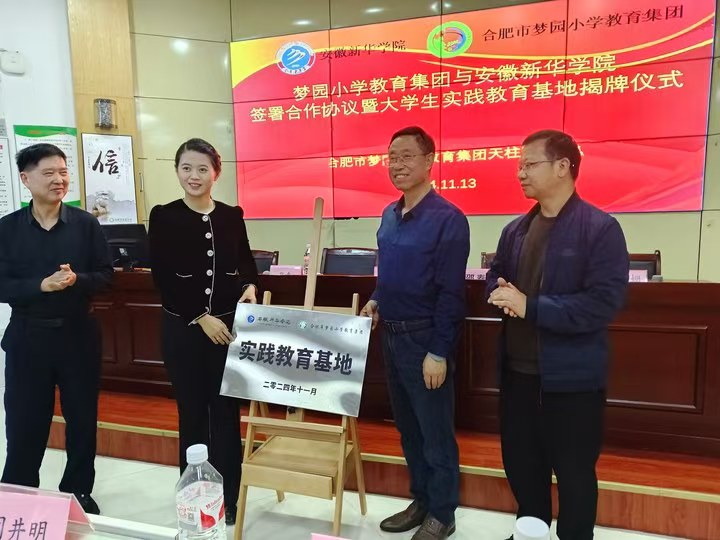 本网讯(通讯员:韩宝阳 丁则智)为进一步推进访企拓岗促就业专项行动,提高实习就业工作质量。2024年11月13日,bat365与梦园小学教育集团天柱路学校(西区)举行合作签约仪式,共同揭牌大学生实践教育基地。合肥市高新区社会发展局教研室主任张奎,合肥市梦园小学教育集团领导党总支书记、总校长邵春荣,副校长马路姚、许姗姗,教务处主任王玮,bat365在线中国官网登录入口文化与传媒学院执行院长洪玉,教育系副主任林斗秀,艺术学院表演系副主任闫井明以及相关实习指导教师、21级小学教育专业实习生、2022级小学教育专业1班全体学生参与本次活动。
