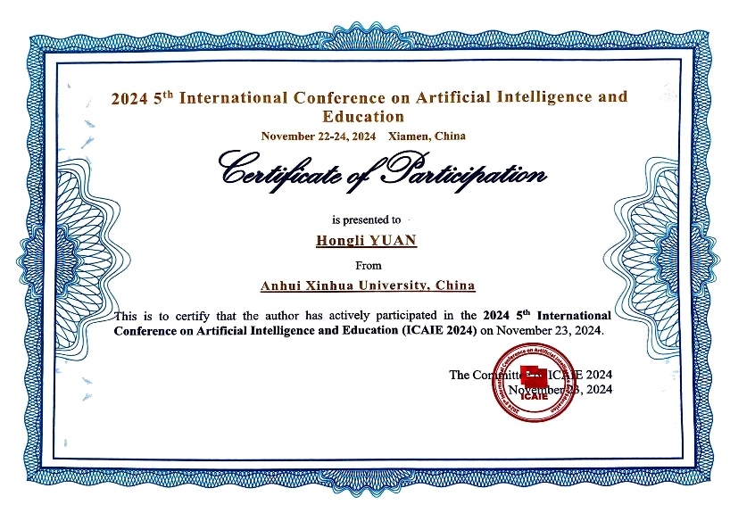 在会议的最后,原红丽老师获得了会议组委会颁发的参会证书。通过此次会议,原红丽老师与国际学术界同行们就教育与人工智能结合的前沿问题进行了深入交流,进一步拓宽了学术视野。