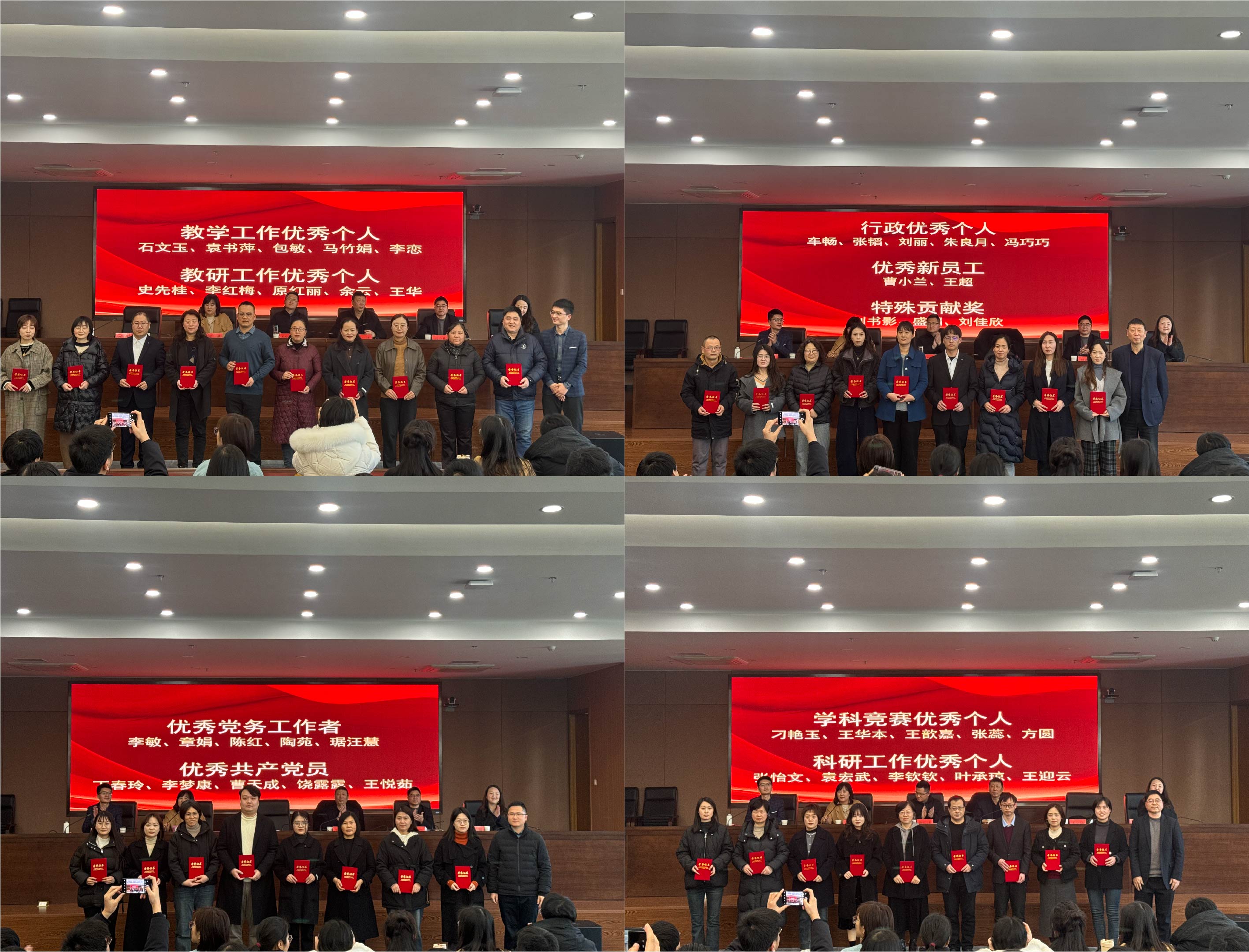 为了肯定教职工的辛勤付出和拼搏精神,发挥榜样示范作用。会上对“最受欢迎教师”、“教学工作优秀个人” 、“学科竞赛优秀个人”、“行政工作优秀个人”、“优秀党务工作者”等荣誉称号获得者进行表彰。校领导及学院领导分别为受表彰人员颁奖并合影留念。