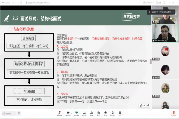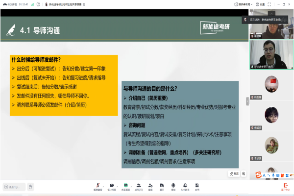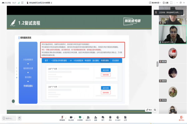 会上,王志勇老师以"复试突围与调剂策略"为主题展开系统指导。他结合最新考研政策动态,从材料准备、专业笔试、综合面试、英语考核四个模块梳理复试全流程,重点讲解了学术简历撰写、导师研究方向匹配、论文研读等备考细节。