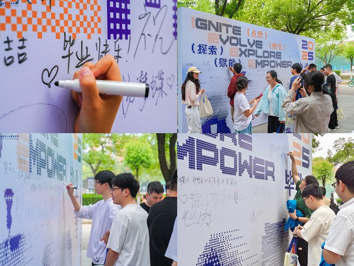 毕业生们在学院一楼精心布置的留言墙前久久驻足,用笔墨书写下自己的名字以及对母校的眷恋与对未来的期许。留言墙前不时爆发阵阵笑声与掌声,不少低年级学生专程前来"打卡",有人认真抄录学长学姐的寄语作为自己的座右铭。