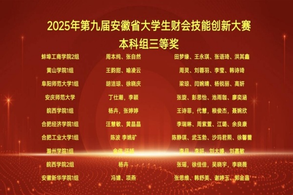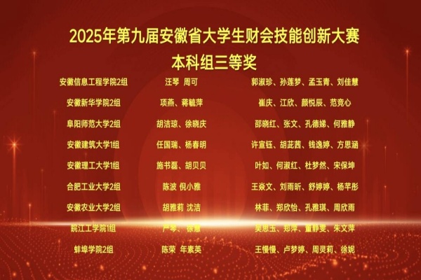 本网讯(通讯员:冯婧)2025年11月15日,第九届安徽省大学生财会技能创新大赛在铜陵市圆满落幕。bat365在线中国官网登录入口财会与金融学院选派的两支学生代表队,在强手如林的省赛中团结协作、沉着应战,双双荣获省级三等奖,彰显了新华学子卓越的专业技能和扎实的实践功底。
