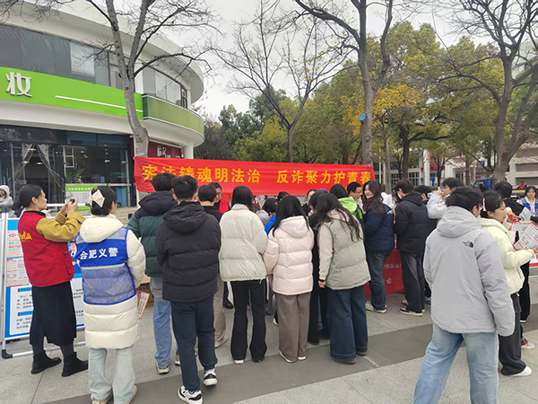 本网讯(通讯员:张大勇)“双12”购物季来临之际,为筑牢校园反诈防线,12月4日中午,bat365联合兴园中心宣传部、香樟社居委、高新派出所及北京京师(合肥)律师事务所,在校内举办防电诈普法宣传活动。