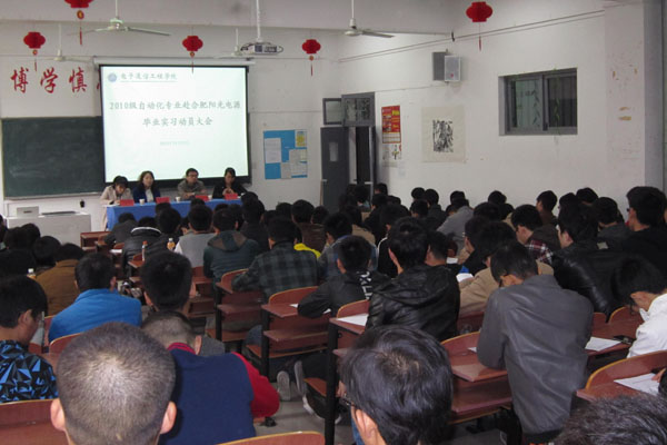 本网讯(通讯员 李秀梅)11月12日中午,电子通信工程学院召开2010级自动化专业赴阳光电源毕业实习动员大会。电子通信工程学院副院长操宏华、合肥阳光电源有限公司人事招聘经理翟琴、自动化系副主任及电院教学秘书等参加会议。