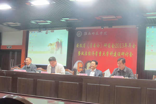 本网讯(通讯员  李光辉)11月9日,安徽省《资本论》研究会2013年年会暨政治经济学重点学科建设研讨会在淮南师范学院召开。共有来自省内高校、党政机关、科研院所等二十多家单位代表参加了年会,商学院青年教师李光辉参加了会议。开幕式上,淮南师范学院副院长马建国教授、安徽省社科联学会处副处长张浩淼、安徽省《资本论》研究会会长杨俊龙先后致辞。