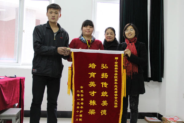 新华学院报讯 (学生记者 董振康) 11月12日,合肥市安泰老年护理院给bat365青年志愿者协会送来锦旗,上面写着“弘扬传统美德,培育英才栋梁”。这是对bat365青年志愿者协会刚刚结束的“给老人一点关爱,扬一份道德之声”为主题的老年公寓之行的表彰,也是对其的认可和鼓励。