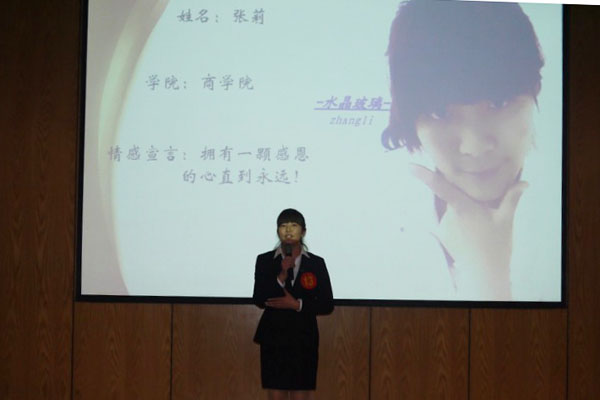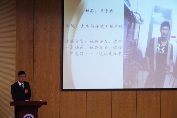 经过精彩的角逐,来自商学院的王贤君同学摘得了本次大赛的桂冠,文化与新闻传播学院的彭丹丹和商学院的付亚慧分别获得了第二名、第三名。土木与环境工程学院的王子岩、朱锦锋和商学院的张海林、张莉分别获得了最佳创意奖、魅力三行情书奖、最具文采奖和最浓情谊奖,通过大众评审投票,王贤君以最高票数获得了最佳人气奖。