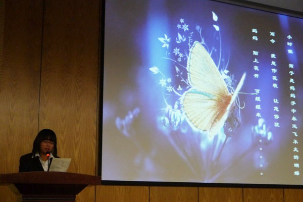 在决赛的第二个环节,每位选手都深情地朗诵并解读了自创的三行情书。简短而富有深意的诗句,配以生动优美的图片,比赛现场氤氲着浓浓的诗情画意。