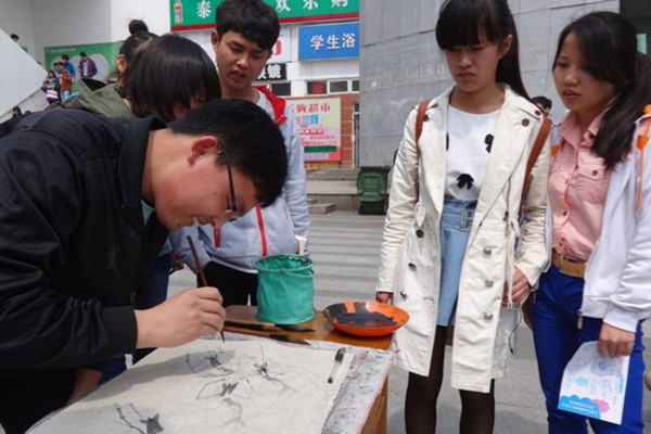 第四节课刚下课,一曲悠扬的古筝曲奏起,参加快闪活动的成员们迅速跑到翰林广场,摆好桌子,铺上宣纸,拿起画笔、毛笔,现场写字作画。这出人意料的表演迅速吸引了大批同学围观。十分钟后,快闪达人们迅速撤离了现场。