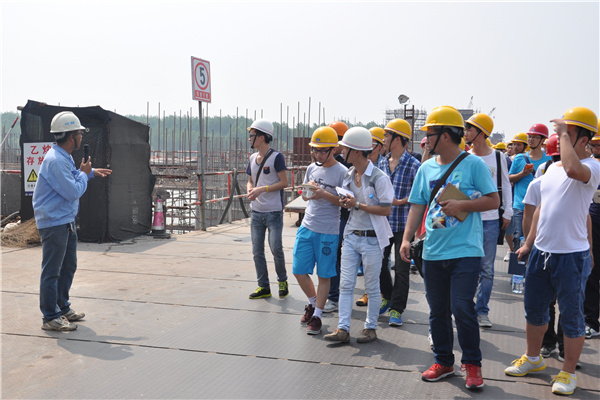 在实习过程中,虽然天气炎热、工地条件艰苦,但是每位同学都十分珍惜难得的实习机会,通过参观、讲解和现场讨论,了解土建工程的设计要求,构造型式和使用要求;了解各种结构形式及布置方案、节点联结方式和受力特点;了解建筑物的施工过程、构件的制作和建筑施工机具的使用情况等。相关单位派出工作人员为同学们做现场讲解,老师们也及时为同学们答疑解惑。