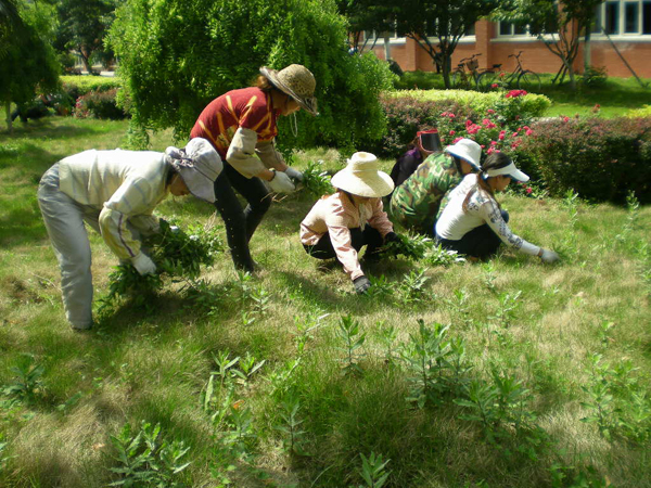 为了美化校园环境,总务处绿化环境中心组织130多名保洁人员参加拔除杂草的义务劳动,为十年校庆增彩。