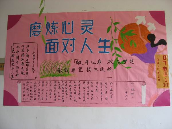 为了迎接本次比赛,各班板做了充分的准备,除了在板报的主题、内容、版面设计等方面下足功夫之外,还考虑到配合整个教室的装饰风格,进行整体设计。同学们的创意连连,想象丰富,评委们看得也十分仔细,对板报进行逐层分析,并对板报的独特和不足之处加以点评和指正。有的板报办的别出心裁,内容新颖,吸引了评委和同学们长时间的驻足观看。最终,09级通信工程1班获得本次比赛的冠军。