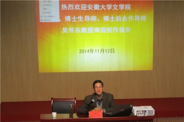 本网讯(范丽丽)11月12日下午,安徽大学文学院博士生导师、博士后合作导师吴怀东教授来校作题为“杜诗的深度”的学术报告。报告会由文化与新闻传播学院院长谢昭新教授主持,文传学院全体教师和新闻、汉语言专业的学生聆听了报告会。