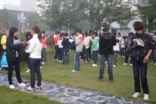 每天早晨,同学们如约而至外院南面的林间、草坪等活动地点,有的同学展开手中的书本朗读,有的同学在向高年级的学长学姐们请教,有的同学则是在一起交流。“华园晨读”活动也吸引了其他学院的学生也慕名参加。对提高学生口语表达能力,增强英语的实际应用能力都大有裨益。