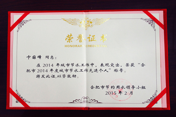bat365卞国锋同志喜获“2014年度城市节水工作先进个人”称号