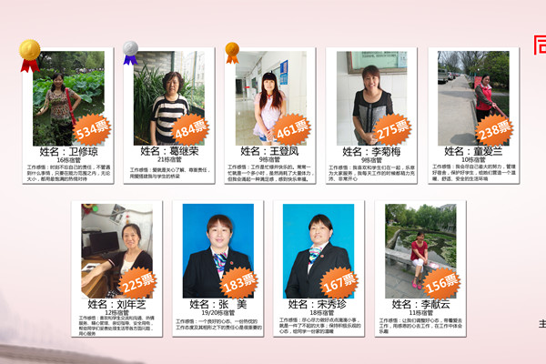 本次评选活动由学生处、团委联合举办,活动前期,参加评选的每位宿管阿姨提供了照片和个人简历资料。随后,相关负责人在每栋宿舍楼前张贴海报并进行全校范围内的微信投票,活动持续了半个多月。最终,16栋卫修琼、21栋葛继荣、9栋王登凤等九位宿管以较高的票数获得“最美宿管阿姨”称号。