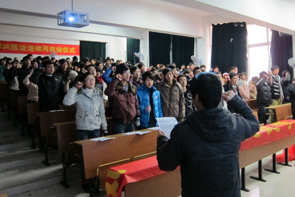 加强学风建设,遵守考试纪律,做一个文明的大学生。学生处处长朱兆健在讲话中充分肯定了此次活动的意义。他说,期末考试将近,学风问题和诚信问题成为时下师生讨论的热点,可务实的作风也该被提出来的,学生干部要起先锋模范作用,无愧“大学生”这个称号;活动没有选在校大礼堂举行,也没有选在学术报告厅举行,而是选择一间普通的多媒体教室举行,朴素、不张扬,又不失意义,需要的是务实;考试体现着老师的教和学生的学,大学生必然有一定的素质,从小事做起、从自我做起、从慢慢积累沉淀而增强的,遵守纪律,做个有素质的大学生。(文/彭敏、蔡红,图/校学生会供)