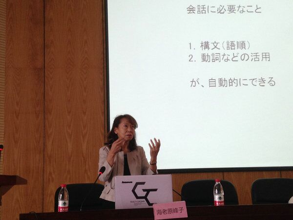 会上,海老原老师首先以常用句型为例,就如何用地道的日语会话,让在场学生进行积极练习。之后针对初学者提出了动词速记法,并总结了在五十音图的基础上进行动词变形的规律。海老原老师的这种教授法及其成果针对性强、切合实际,对于初学者和教授初级日语的教师来说都非常实用。在讲解过程中,海老原老师始终以学生为中心,让学生进行即时练习并实时反馈,对学生们在学习中所遇到的困惑和难题给予了建议和答复。