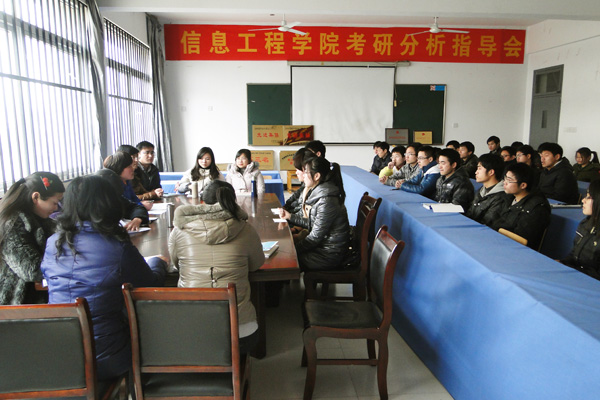 信息工程学院今年报考研究生的人数比去年有了明显的增长,成绩在300分以上的同学人数也有一定的提升,是学风建设的体现。信息工程学院行政副院长钱颜娇提醒同学们密切关注网上有关考研的动态,对于分数“危险”的同学要及时与调剂院校联系。教学副院长胡学联在会上说,同学们要走的路还很长,做好充分的准备,复试才能取得好成绩。考上研究生以后,更要努力学习,在自己的专业领域取得一定的成绩;而本次考试落榜的同学也不用灰心,只要踏实肯干,行行都会出状元。