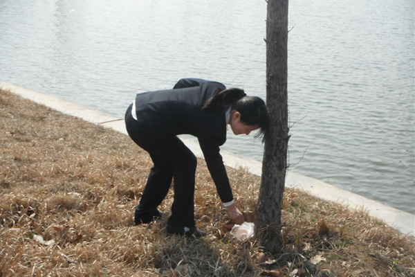 3月14日,2010级药品检测技术(2)班同学一起相聚在华园的如琴湖畔,扫树叶、捡垃圾,美化校园。同学们深切感受到,校园的美丽是需要靠大家细心维护的。愿在华园的每位同学都怀着对学校感恩之情,爱护华园的花花草草,给予自己一份约束,不要随便扔垃圾,相信这样华园会因你而更加绚丽。