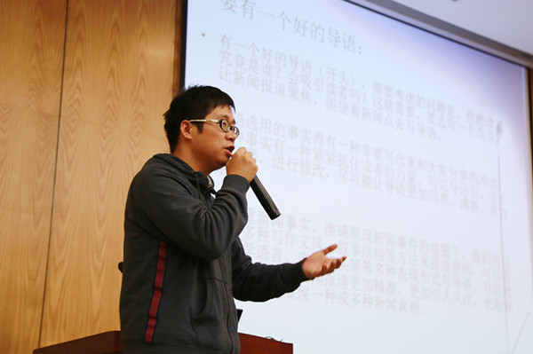 周晔结合自身采访经历,生动地讲述了采访过程中遇到的故事以及深入采访的要领和窍门,就如何更好地提高知识素养和实践能力给广大学子“支招”。他说,新闻写作需要扎实的采访,只有充分挖掘新闻事件背后故事和细节,才能写出好的新闻。新闻采访与写作从选题构思、资料调研到最后内容的检查与核实都要按照一定的程序进行,不能有任何的遗漏与疏忽。他还强调了一个好的导语对整篇文章的重要性。周晔老师幽默诙谐的谈吐、深入浅出的演讲方式赢得了在场听众的阵阵掌声。