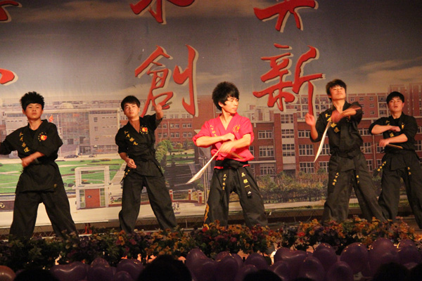 紧接着精彩节目轮番登场,异彩纷呈。铿锵有力的B-BOX表演,惟妙惟肖的杰克逊舞蹈模仿秀,外籍教师julius的舞曲表演……伴随着大合唱《my love》优美动听的旋律,英语俱乐部主席缓缓推上一块三层蛋糕,烛光摇曳中,外国语学院英语俱乐部十周年庆典晚会圆满落幕。(文、图/英语俱乐部,审核/余立新)