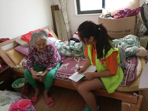 在入户探访的同时,队员们不辞辛苦,用设计好的健康问卷对回迁社区低收入的特殊老人进行调研,了解他们的健康状况。有的老人因年龄大、语言能力弱,实践队员与他们交流起来很困难,但大家都非常有耐心,一遍一遍的重复着问题,并认真记录。