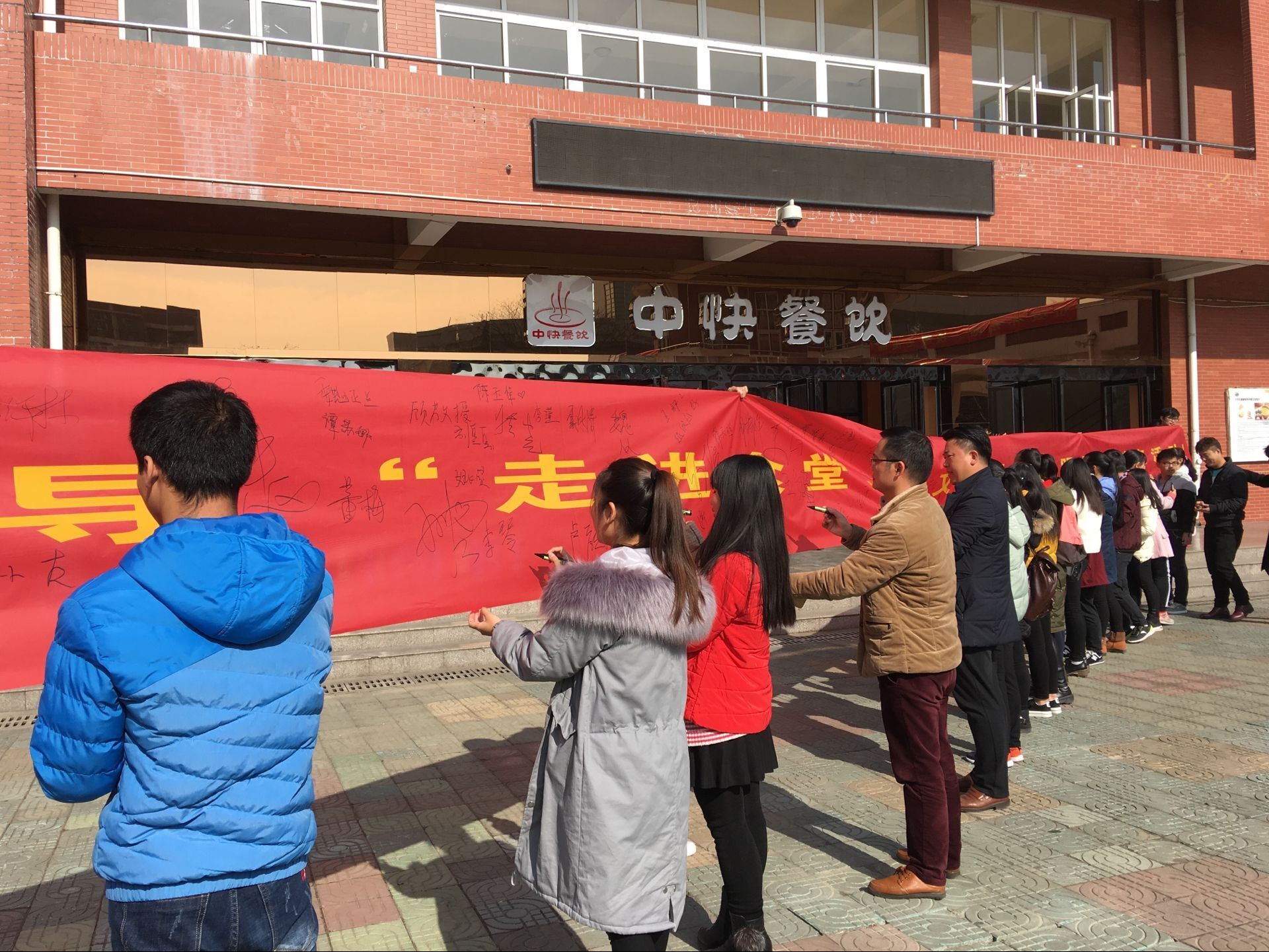 签名活动分别设在校中快食堂和翰林食堂门前广场,总务处相关人员负责活动现场的秩序维护,并对前来就餐的学生进行文明就餐相关教育引导。整个活动持续了近两个小时,现场气氛热烈,来往的师生纷纷在宣传横幅前驻足签名,并对活动的开展表示赞成和支持。