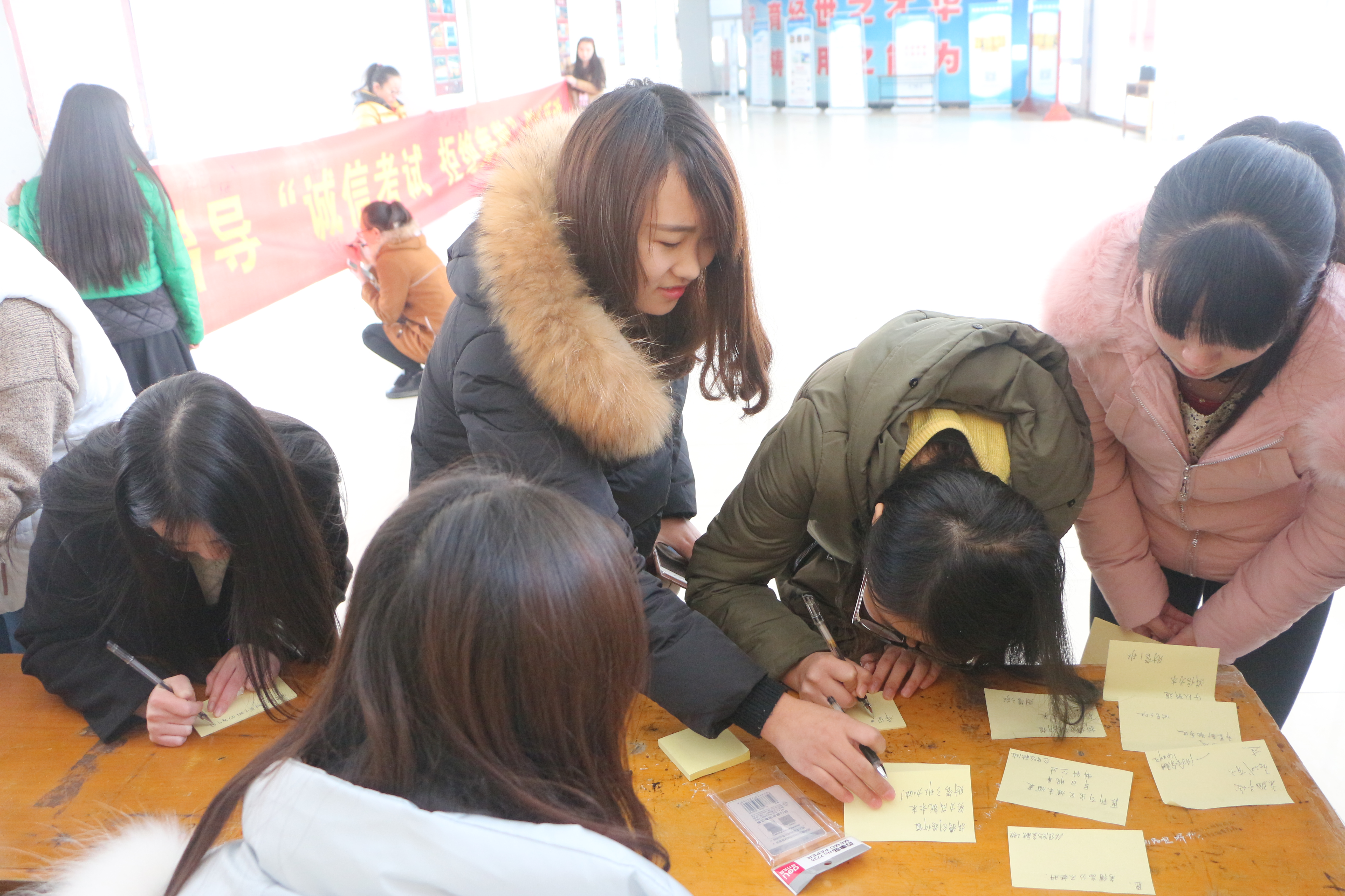 在学生会各个部门齐心协力的准备下,“诚信考试”签名活动一开始,就吸引众多学生来到横幅前,积极地参与到活动中来,一笔一划中展现着他们对诚信考试重要性的认知。