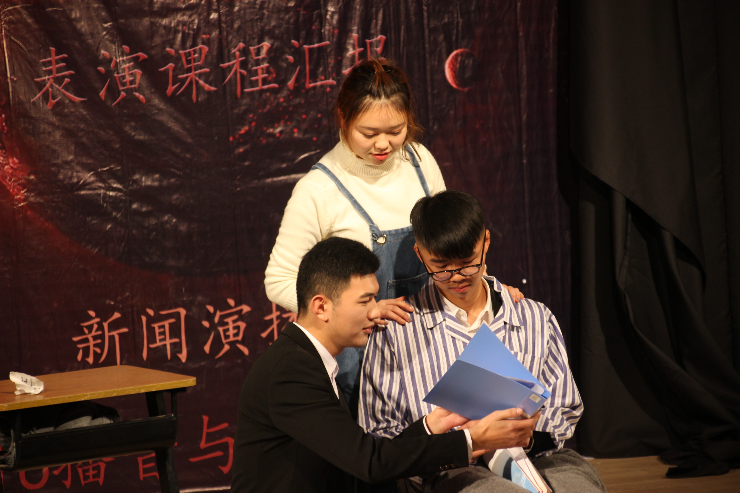 本网讯(通讯员:马兰、洪玉)2016年12月22日晚,2016级播音与主持艺术专业全体学生在新闻演播厅进行了表演课程的结课汇报,新闻系副主任洪玉、播音主持专业教师以及辅导员观看了汇报演出。